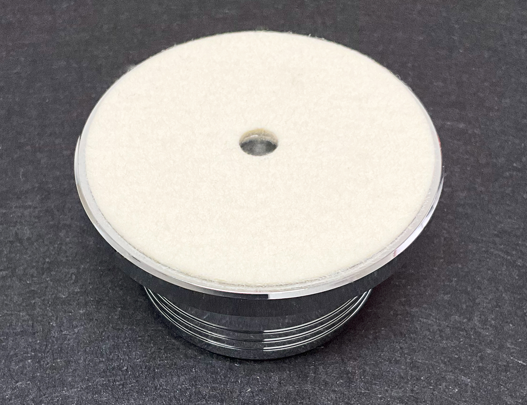 クロームメッキをした軟鋼を採用。様々な素材の中から、加工しやすくかつ振動対策のために重量を確保できる素材とメッキを選びました。レコードに接する底面には薄いフェルトを貼り、レコードを痛めません。また、そのことにより音に独特の温かみが加わり、長時間聞いても聞き疲れがしません。